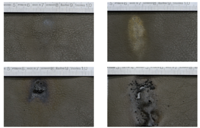 After 30 seconds of pouring, remove the sample and visually examine the PVC sheet for any signs of damage. In the event that the PVC sheet has the sample attached to the sample or small residues, if these can be removed with a soft paper cloth (dry or damp), this can be considered as suitable.
