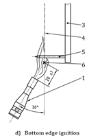 -Burner preparation: Place the burner horizontally without flame perpendicular to the specimen with an upward inclination of 30º for the lower edge of the specimen. Ensure that the distance between the tip of the burner stabilizer and the bottom edge of the specimen is 20 ± 1 mm. Check the position of the burner every 6 specimens.