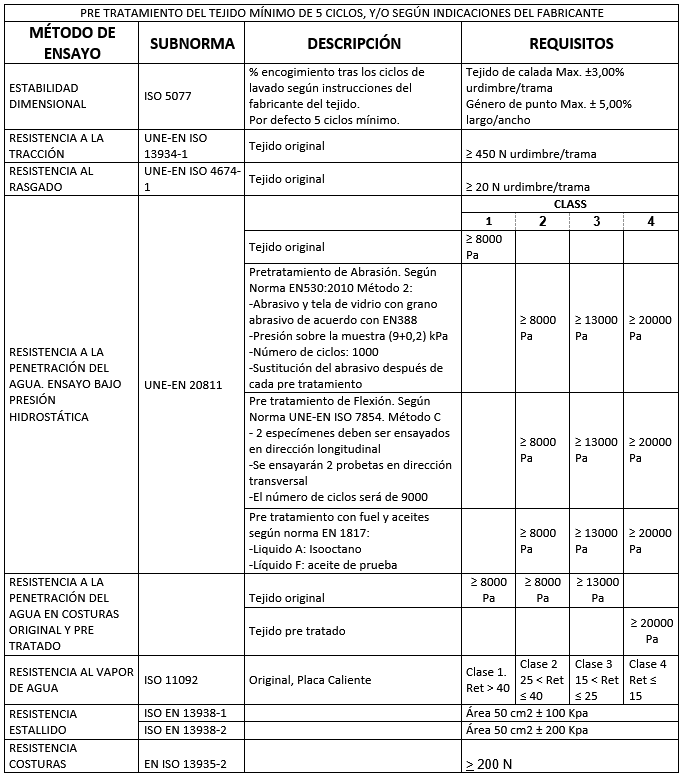 La norma internacional UNE-EN 343:2019 establece requisitos esenciales de seguridad mínimos y métodos de ensayo para la ropa de protección contra los efectos de las precipitaciones (por ejemplo: lluvia, nieve), la niebla y la humedad del suelo