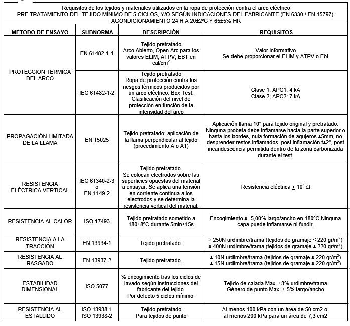 Esta norma específica los valores de protección que deben cumplir las prendas y tejidos frente al Arco Eléctrico. Los niveles de protección se pueden utilizar conforme a las siguientes normas: Open Arc EN 61482-1-1 que registra los valores de arc rating [ELIM (límite de energía incidente sin probabilidad de quemadura), ATPV (Valor de rendimiento térmico del arco) y/o EBT (Energía umbral de rotura abierta)] o¡o Box Test EN 61482-1-2 en la Clase 1 (4 Ka) o Clase 2 (7 Ka)