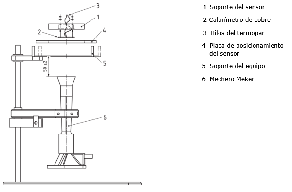 • Índice de transferencia de calor, HTI: (llama) tiempo medio, tm redondeado al segundo, necesario para obtener un incremento de temperatura de (24 ± 0,2) °C cuando se ensaya por este método, usando un disco de cobre de masa (18 ± 0,05) g y un flujo de calor incidente de (80 ± 2) kW/m2, proveniente de una llama de mechero de gas propano del 95%.